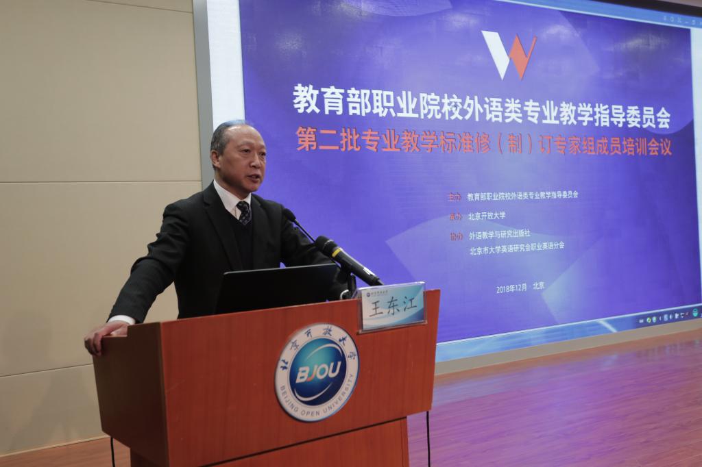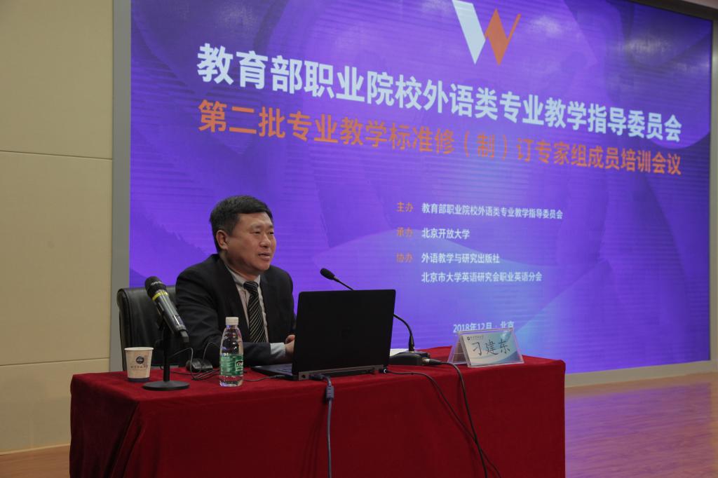 刁建东主任在致辞中向大家介绍了外语教指委第二批专业教学标准修(制)订的工作进度,并说明了此时召开培训的重要性与必要性。刁教授强调,标准制(修)订工作任务繁重,一定要做好培训,参加培训的专家组成员要站在国家战略的高度,积极征询企业行业的意见,认真调研,使出台后的标准符合院校教学实际,更好地发挥外语教指委研究、咨询、指导和服务的作用。