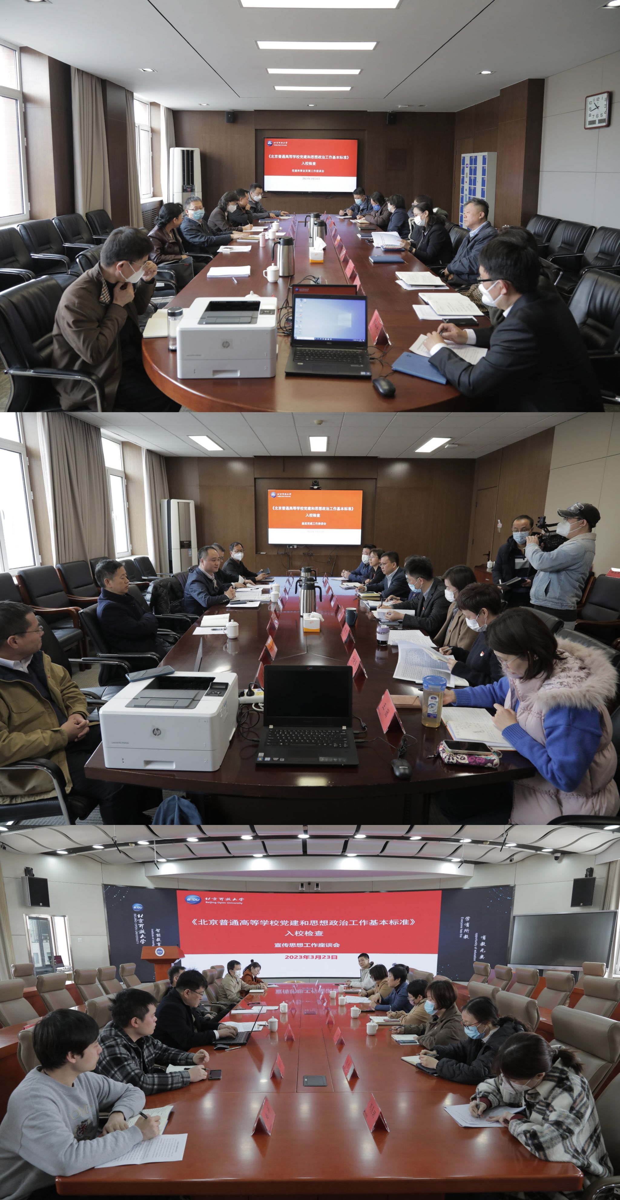 3月23日,《北京普通高等学校党建和思想政治工作基本标准》检查组到学校开展检查工作。检查组通过听取汇报、查阅资料、座谈交流、实地走访等方式,对学校五年来党建和思想政治工作情况进行全面考核评估。