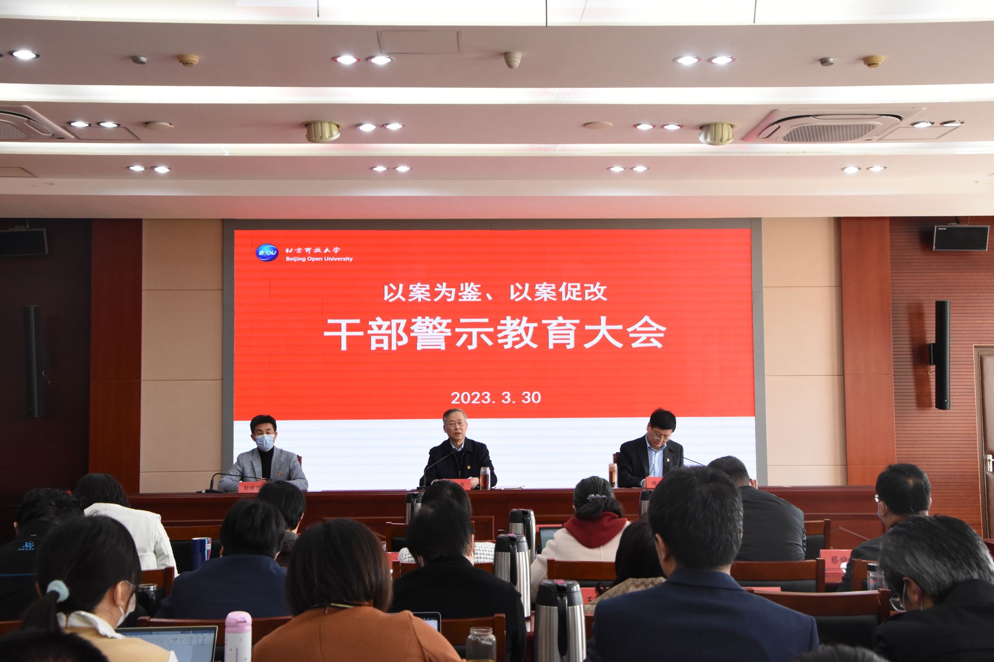杨公鼎在干部警示教育大会上点人点事通报了党委日常监督和纪委监督执纪中发现的典型问题,深刻剖析了问题根源,并从正确行使权力、严格遵守法纪、带头廉洁自律、自觉接受监督四个方面对进一步加强纪律作风建设提出要求。杨公鼎指出,加强干部警示教育,要坚持以案为鉴、以案促改,通过身边事教育身边人,目的是为了警钟长鸣、防微杜渐,是让党员干部受警醒,明底线、知敬畏,主动在思想上划出红线,在行为上明确界限,真正敬法为纪,遵规守纪。学校各级党组织、党员领导干部要把思想和行动统一到习近平总书记重要讲话精神和党中央、市委的决策部署上来,认真学习领会党委落实全面从严治党年度任务安排,吃透要求,靠前指挥,强化执行,团结带领全体教职工守正创新,踔厉奋发,勇毅前行,以昂扬的精神状态,扎实的工作作风,奋力谱写学校全面从严治党新篇章,为学校实现更好更快发展坚强的政治保证。