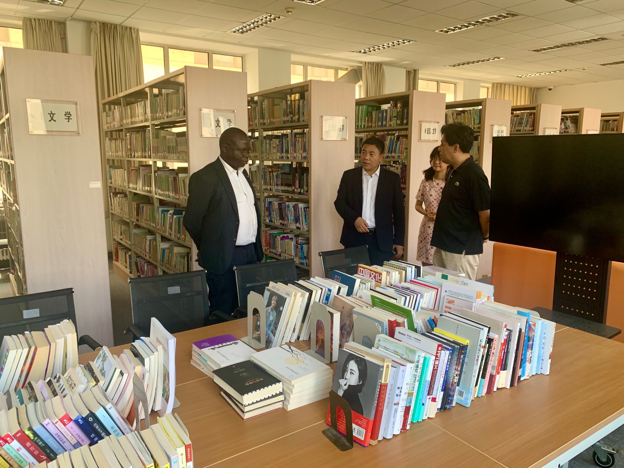 座谈会后,学校数字资源中心工作人员陪同外宾参观了演播室、图书馆。