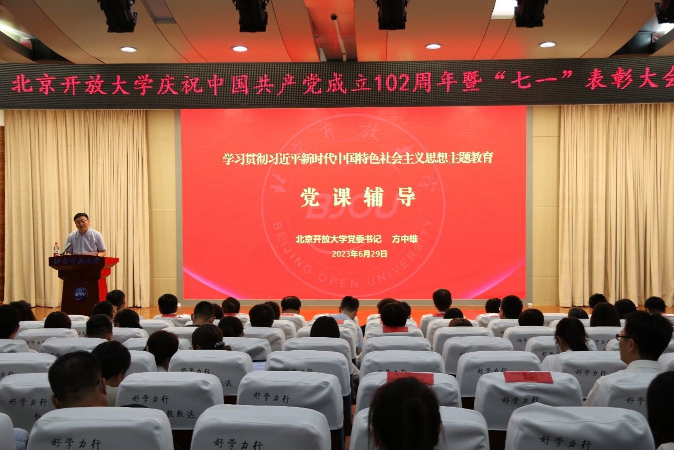 6月29日,党委书记方中雄在学校庆祝中国共产党成立102周年暨“七一”表彰大会上,围绕主题教育有关要求,为全校党员作专题党课辅导,市委主题教育第十八巡回指导组副组长白立成与部分成员到会指导。党课以学习贯彻习近平新时代中国特色社会主义思想为主线,结合学校的发展形势,从以学铸魂、以学增智、以学正风、以学促干等四个方面进行授课辅导。围绕“十个明确”理论总结、“十四个坚持”基本方略、“十三个方面成就”实践总结,系统重温了习近平新时代中国特色社会主义思想的主要内容和精髓要义。围绕“六个必须坚持”等立场观点方法,强调要坚持人民至上,贯彻“以学生为中心”工作理念,解决“为谁发展”的问题,贯彻“以教师为中心”工作理念,解决“靠谁发展”的问题,扭住高质量发展中心工作,解决“怎样发展”的问题;要坚持自信自立,充分认清学历教育、社区教育、老年教育、职业培训、家庭教育等对经济社会的重要意义,坚定投身开放教育的信念信心;要坚持守正创新,总结和坚守过去的有益探索、实践经验、建设成果,确立高质量发展办学方略;要坚持问题导向,突出办学优势与亮点,规避办学风险与管理盲区,培育和做大新的增长点;要坚持系统观念,处理好办学治校各个领域、各项工作之间的一系列关系,以系统观念打造开放融通的教育生态圈,实现开放大学的不可替代性;要坚持胸怀天下,与国内外开放大学、教育机构开展跨地区交流合作,不断增强教职工对发展中的开放教育的全面认识和适应能力。要大兴务实之风、弘扬清廉之风、养成俭朴之风、锤炼师德师风,主动作为、脚踏实地,全面查找廉洁风险点,筑牢思想防线,始终保持艰苦奋斗的优良作风,持续完善师德师风建设长效机制。围绕主题教育和学校“创新发展年”一系列工作要求和重点任务,深入调查研究察实情、做到精准施策出实招、解决实际问题求实效,以高度的责任感、使命感和主人翁精神,共同开创学校全面建设发展新篇章。