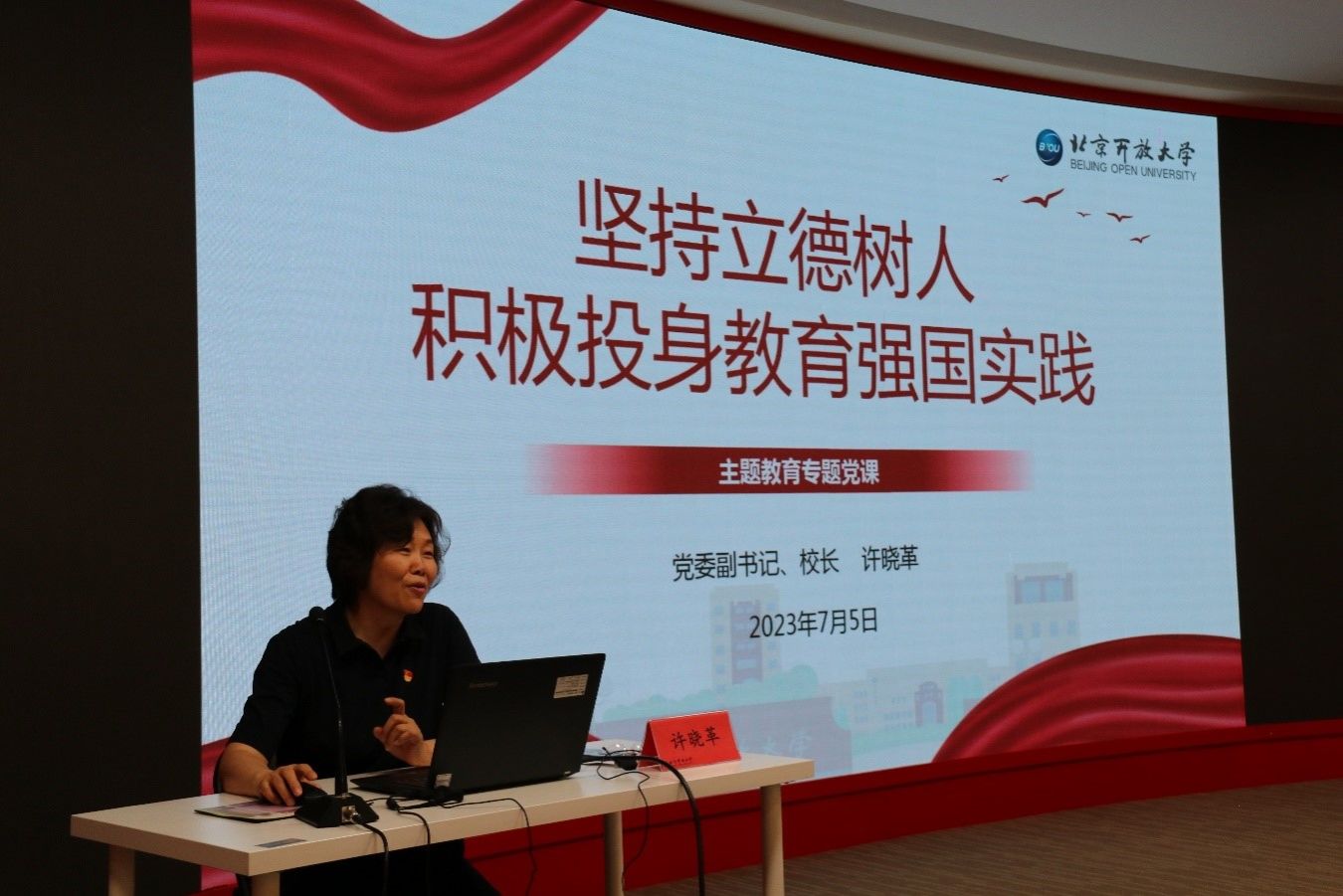 7月5日,党委副书记、校长许晓革聚焦“坚持立德树人,积极投身教育强国实践”这一主题,为国开业务部党员、教职工讲授专题党课。市委主题教育第十八巡回指导组赵永刚、徐敬尧、张聪等同志到会指导。许晓革从“立德树人”的时代演进、坚持全面发展是立德树人的价值指向、坚持“为党育人、为国育才”落实立德树人根本任务、坚持改革创新是实现立德树人的根本动力、以“立德树人”落实“两个服务”等五个方面进行了教育辅导。党课重温了党的二十大报告、《中国教育现代化2035》、习近平总书记关于教育工作的重要讲话等内容,结合市委教育工委领导来校调研提出的工作要求,引导大家深刻认识“坚持立德树人”的历史地位和重大意义。她指出,要坚持以高质量党建推动引领高质量事业发展,坚守“为党育人,为国育才”的初心使命,切实担负起为首都经济社会发展培养具有自我学习和自我发展能力、富有社会责任感和创新精神的应用型专门人才的职责与使命。要抓住时代机遇,为个性化学习、终身学习、扩大优质教育资源覆盖面、实现教育现代化提供有效支撑,将提高人才培养质量作为第一标准,创新人才培养模式改革,扎根京华大地办好开放教育,让习近平新时代中国特色社会主义思想在首都开放教育领域开花结果,形成生动实践。