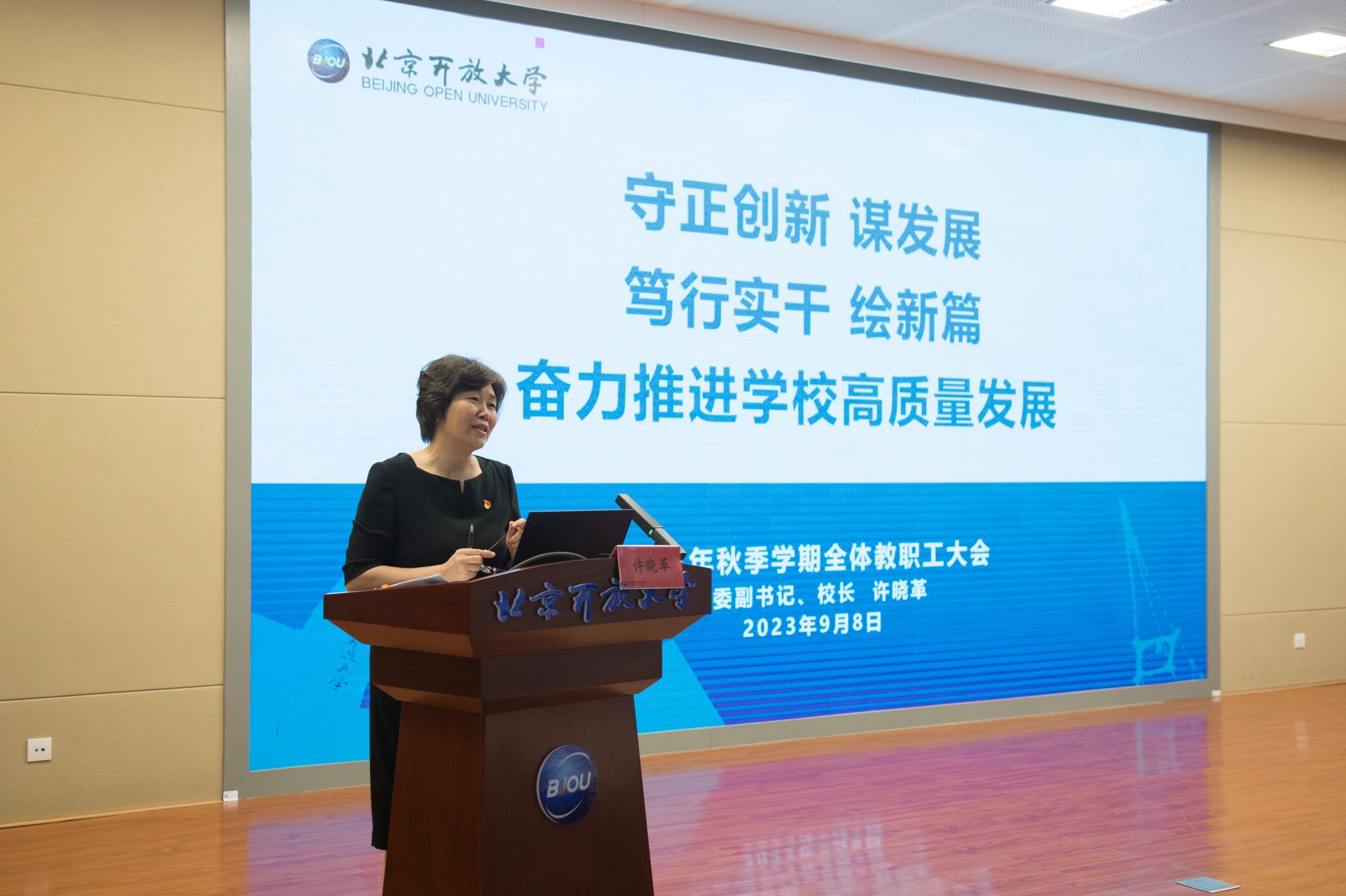 许晓革强调,下半年学校总体工作思路是坚持以习近平新时代中国特色社会主义思想为指导,全面学习宣传贯彻党的二十大精神,以两委换届、国开办学评估、机构调整和新一轮全员聘任为契机,坚持创新驱动高质量发展,推进教育数字化转型,深化教育教学综合改革,不断提高服务全民终身学习和首都学习型城市建设能力,办好人民满意的开放教育。学校将进一步加强党的全面领导,推动党建工作和治理水平稳步提升;深化教育教学综合改革,持续推动学历教育创优提质;聚焦特色品牌建设,推动非学历教育提量增效;加快推进学分银行与信息化建设,推动数字化转型升级;着眼专业能力建设,强化人才支撑和智力保障;推进学校治理变革,不断提升现代大学治理能力和水平。各项任务艰巨、工作繁重、进度紧迫,希望全体教职工主动按下“快进键”、跑出“加速度”,奋力开启“新征程”。