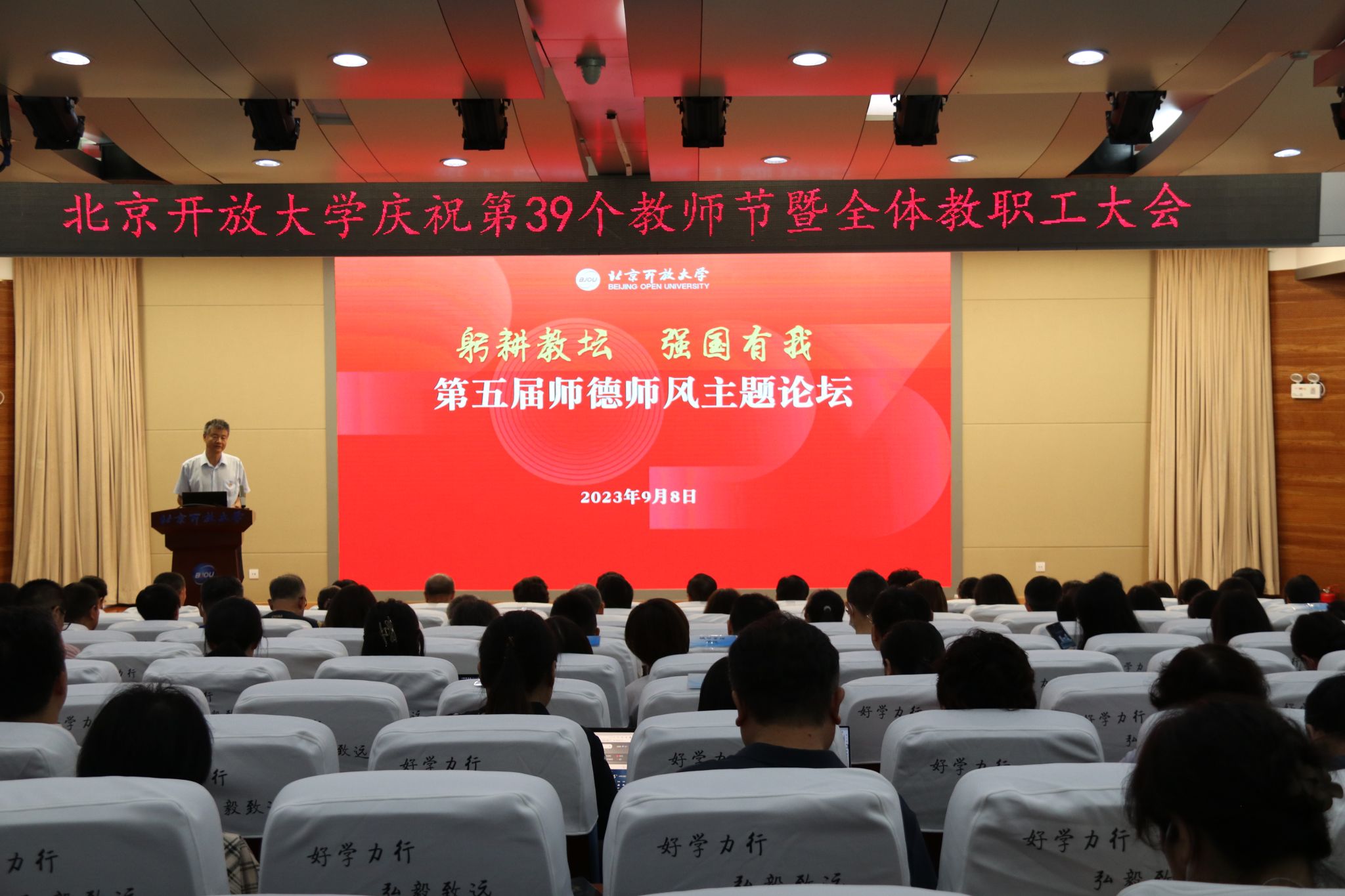 为深入学习贯彻习近平新时代中国特色社会主义思想、习近平总书记关于教育的重要论述,全面落实师德教育集中学习要求,发挥优秀教师示范引领作用,促进开放教育高质量发展,9月8日,在第39个教师节即将来临之际,学校举办了“躬耕教坛,强国有我”第五届师德师风主题论坛暨教师节表彰大会。全体校领导、全体教职工参加了会议。会议由副校长王想年主持。