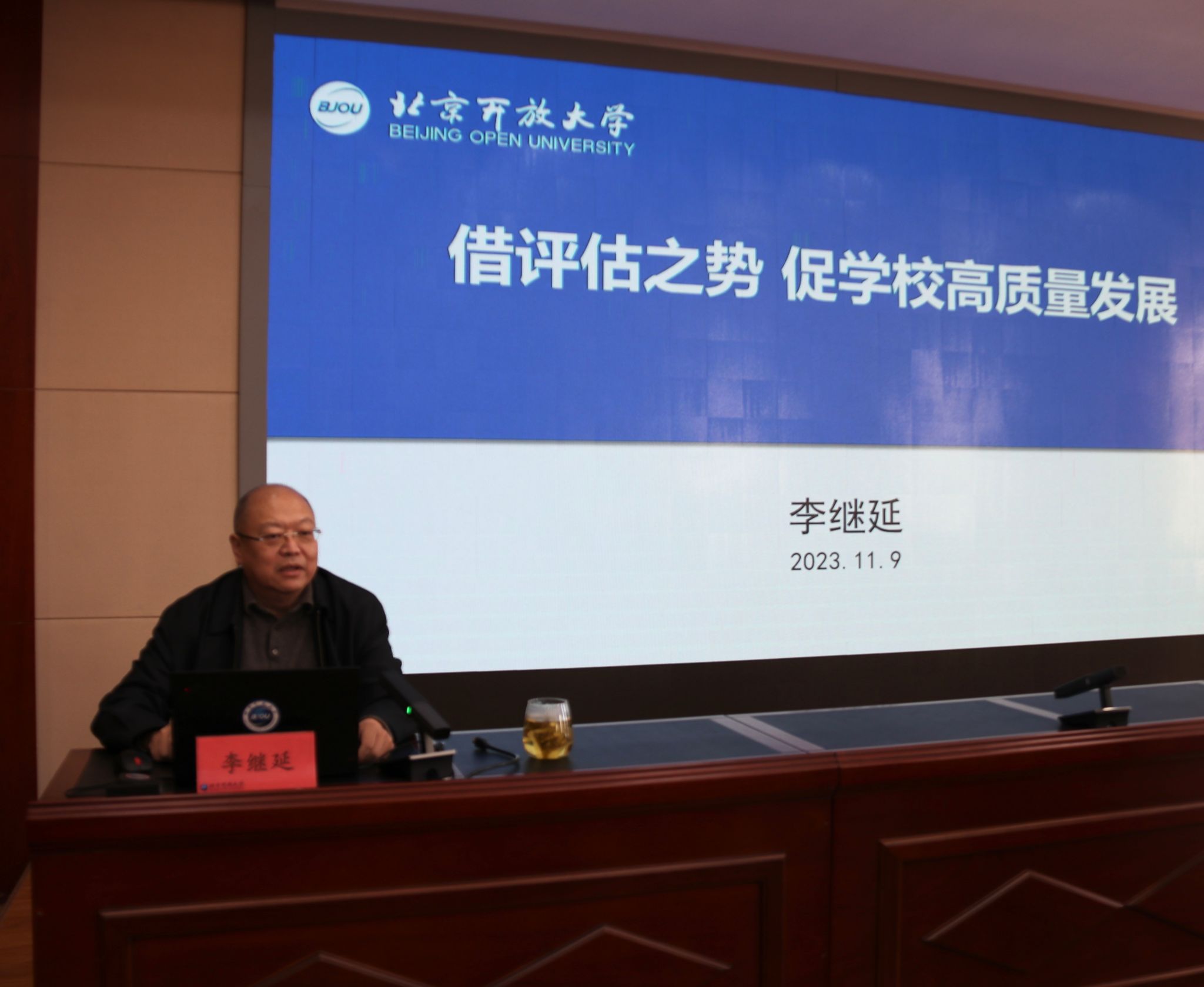 李继延副校长以“借评估之势,促学校高质量发展”为题,对taptap点点从接到国家开放大学办学评估通知开始至今所开展的评估工作进行回顾总结。他指出,taptap点点积极响应总部评估工作,2022年3月,由学校党委组成迎评领导小组,设立迎评工作办公室,正式启动迎评工作,在全校范围内召开系列工作推进会,扎扎实实地开展了32家学习中心办学评估。2023年7月出台《国家开放大学北京分部办学评估迎检工作方案》,确定了入校迎检工作的组织分工、主要任务及进度安排,对各部门及工作组提出了具体要求,将迎评工作小组分为文字材料组、支撑材料组、校园文化和校园环境建设组、宣传报道组、数字化展示建设组共五个小组,分别由校领导牵头,确保各项工作切实落实,迎评工作进入攻坚克难阶段。李继延副校长最后强调了当前迎评工作存在的几点问题和后续的工作重点与要点。