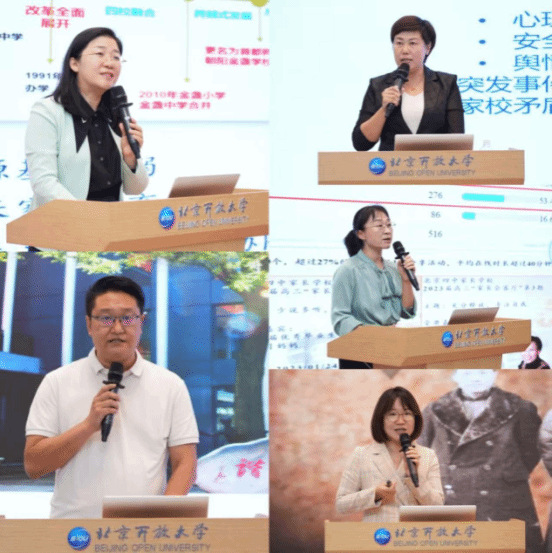 首都师范大学朝阳金盏学校校长李欣、史家胡同小学副校长张均帅、潞河中学附属学校次渠家园校区校长商学芳、清华大学附属小学年级主任申旭兵和北京四中学生发展中心主任高杰分别以《金盏花开育桃李 协同之光照未来》《基于儿童发展的家校社协同育人实践与探索》《校家社协同育人“135+N”同心圆模式探索与实践》《家校携手 同向共育:家校共育管理机制》和《从各自努力到协同发力:家长学校的进阶实践》为题,介绍了学校在协同育人中的探索与成效。“一领两行三合四联五统”工作法,“多元共治”理念,“校为圆心、区为主体、资源为纽带”的协同格局,“家校共育管理机制”的实践经验和家长觉察课程让与会者受益良多。