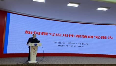 唐德龙副教授做了主题为“如何撰写应用型课题研究报告”的学术讲座。他结合自身科研经历,从什么是应用性课题研究、如何撰写应用性课题研究报告以及如何完善应用性课题研究报告等方面做了详细的讲解。唐教授的报告内容丰富,案例详实,操作性强,给老师们诸多启发。在交流讨论环节,唐教授就学院教师关心的应用性课题申报、研究报告成果化等问题提出了建设性指导意见。