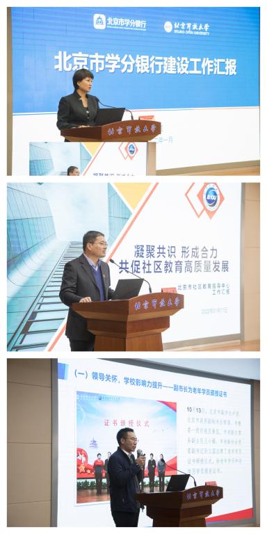 终身教育处处长孙月亚、社会教育部主任王黎明和北京老年开放大学负责人白新睿分别围绕学分银行、社区教育和老年开放大学作了工作报告。孙月亚汇报了2022年北京市学分银行管理中心的工作目标,并从体系构建、建章立制、平台支撑、业务开展四个方面汇报了相关工作举措,同时向各单位推介了新版京学网;王黎明围绕统筹引领、支持服务、试点创新三个方面对社区教育工作举措做了详细阐述;白新睿在老年开放大学工作举措中提出体系建设、课程师资、宣传、教学研究等七方面内容。