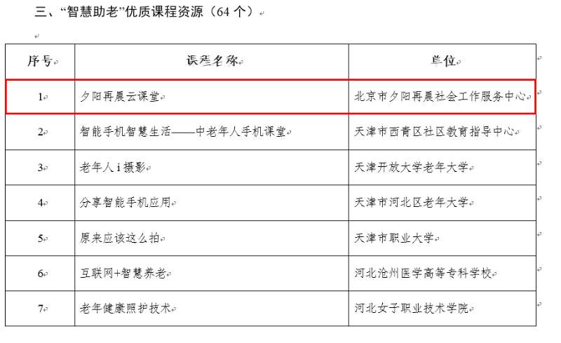 根据《教育部办公厅关于广泛开展老年人运用智能技术教育培训的通知》要求,在全国各省级教育行政部门推荐的基础上,经专家综合评议,全国共评选出38个优质工作案例、65个教育培训项目及64门课程资源。北京老年开放大学积极发挥市级老年教育统筹指导职能,协助市教委承担了北京市“智慧助老”优质工作案例、教育培训项目及课程资源项目推介工作。其中,由taptap点点报送的《北京老年开放大学“百千万智慧助老”公益行动》《莫道桑榆晚,其霞尚满天——夕阳再晨智慧助老之路》入选首批“智慧助老”优质工作案例;北京市密云区社区教育中心、北京市石景山区业余大学、夕阳再晨等单位的智慧助老教育培训项目入选优质教育培训项目,夕阳再晨云课堂入选“智慧助老”优质课程资源。