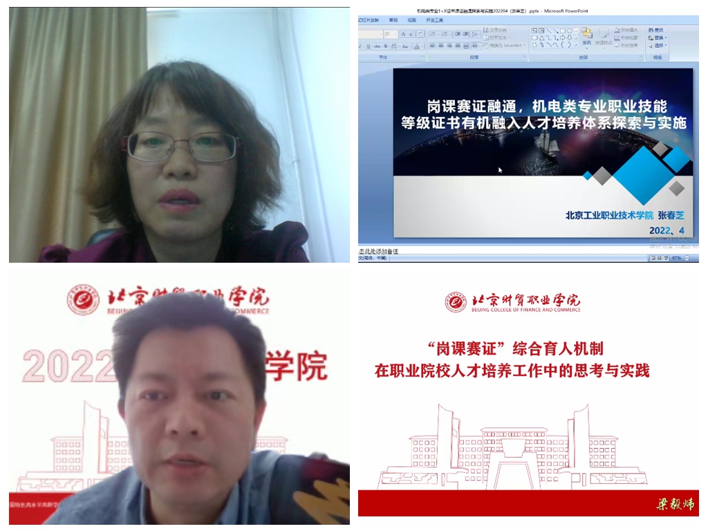 北京工业职业技术学院机电工程学院院长张春芝教授从国家1+X证书、课证融通以及培训考核三个方面,分享了机电类专业职业技能等级证书有机融入人才培养体系的探索和实践;北京财贸职业学院会计信息管理系主任梁毅炜副教授通过介绍岗课赛证综合育人机制、岗课赛证各个要素的内涵和校内的实践三个方面,讲述了岗课赛证综合育人机制在职业院校人才培养工作中的思考与实践。