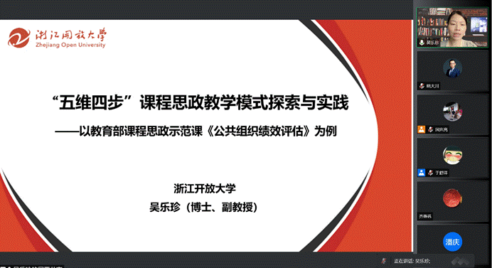 吴乐珍博士以“‘五维四步’课程思政教学模式探索与实践”为主题,结合教育部课程思政示范课《公共组织绩效评估》建设情况,讲解了课程思政的着力点、高效课堂的特征、高效课堂的八大评判标准和“五维四步”课程思政教学模式,并结合知识点“公共部门绩效评估指标与标准”重点展示了如何运用“五维四步”教学模式深入挖掘思政元素,在教学过程中如何运用“启”、“承”、“转”、“合”等方法保持有节奏的教学过程,最终实现知识整合、思维重构、情感升华的课程思政目标,有效提升学生的综合学习体验。