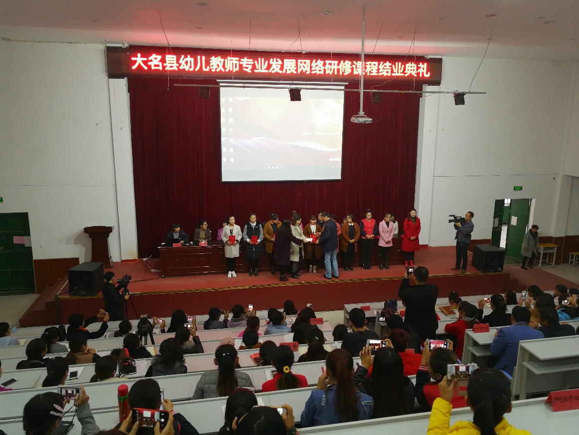 大名县教育局领导宣读了大名县幼儿园教师专业发展网络研修各项优秀名单,为优秀学员、优秀研修小组、优秀幼儿园、优秀乡镇颁奖并合影留念。