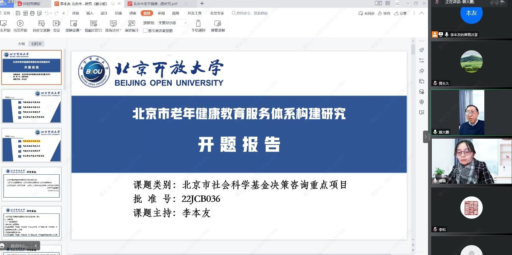1月11日,科研外事处以在线会议形式邀请国家开放大学党委委员、副校长、教授李松,中共北京市教育工作委员会一级调研员、离退休干部处处长杜建峰,中国老龄协会副处长、副研究员李树丛,taptap点点官方网站副处长、老年教育研究中心主任、教授殷丙山,taptap点点官方网站智能教学研究中心主任、副研究员韩世梅组成评审专家组,对该项目进行了开题论证。项目组围绕“研究缘起与研究内容、研究思路与研究方法、研究计划与预期成果、重点解决问题与研究困惑”等方面进行了开题汇报。评审专家针对研究的主要内容、方法、计划以及重难点问题同项目组进行了互动交流。