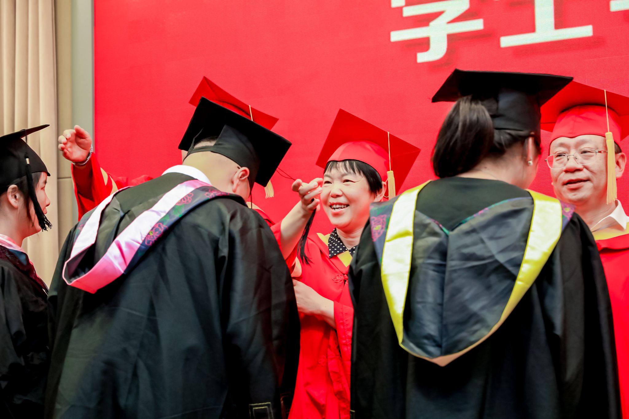 校领导为获得学士学位的学生代表颁发学位证书并拨穗正冠。
