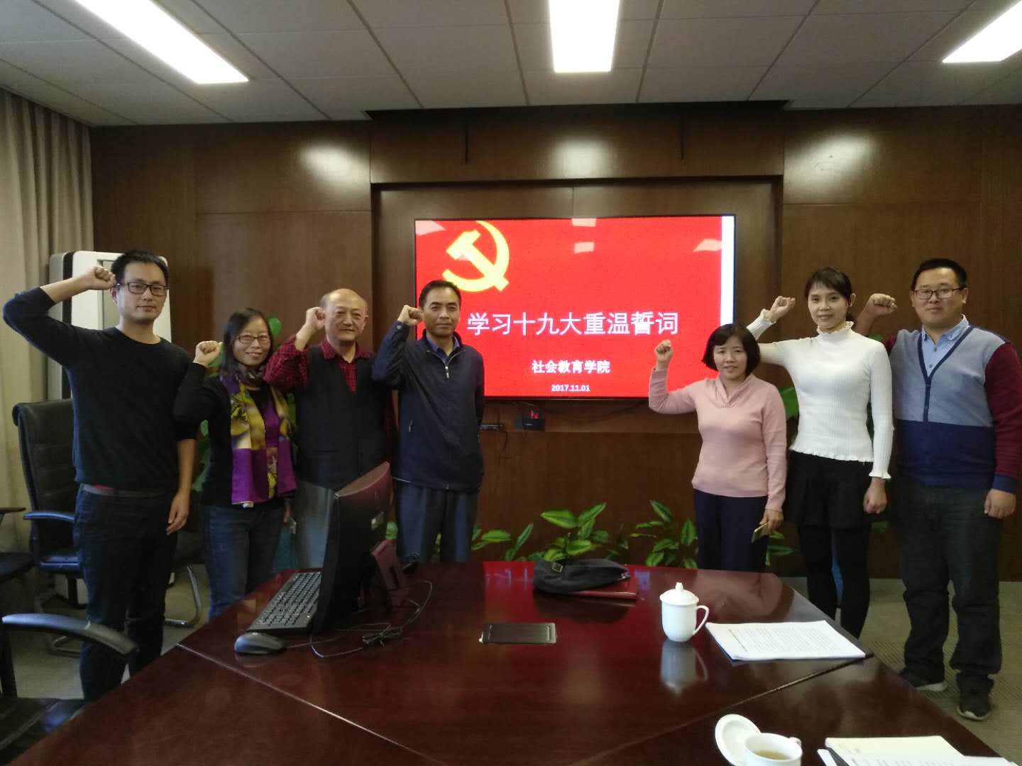 2017年11月1日下午,社会教育学院党支部组织全院教职工专题学习“十九大”报告和和修订后的《中国共产党章程》。邵和平副校长参加学习,并就“十九大”报告的学习作了专题解读。学习由对党支部书... -